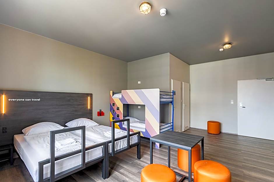 Modern room featuring laminate floors, a TV, and a private bathroom with hairdryer.
